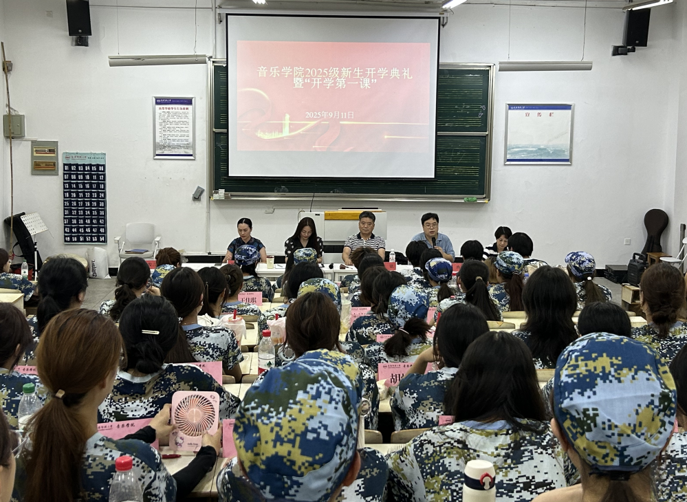 9月11日晚,音乐学院2025级新生开学典礼暨“开学第一课”在艺术楼B107举行。音乐学院党委书记张铭,副院长徐冉、高艳,党委副书记贾涛等出席活动。典礼由徐冉主持。