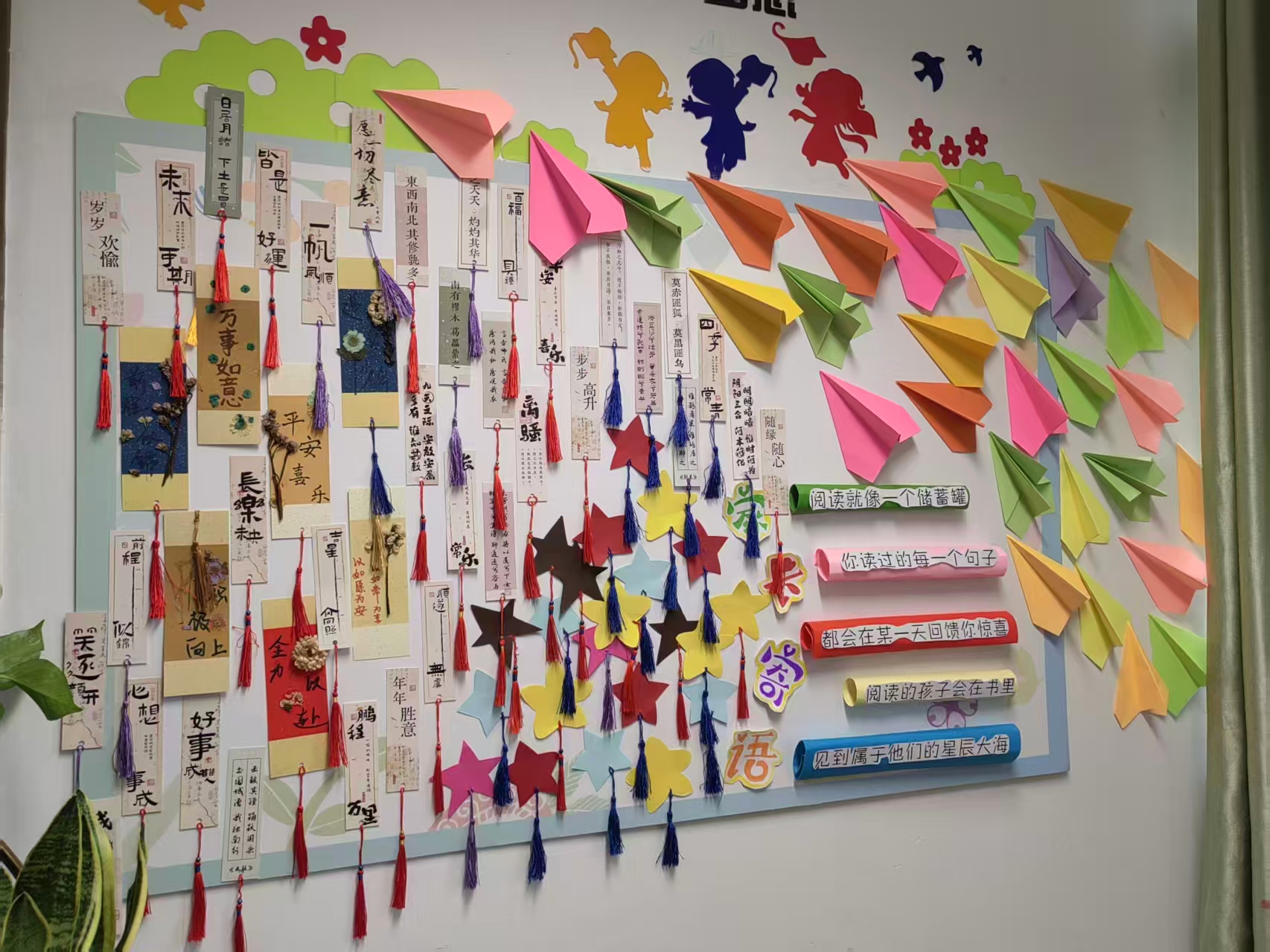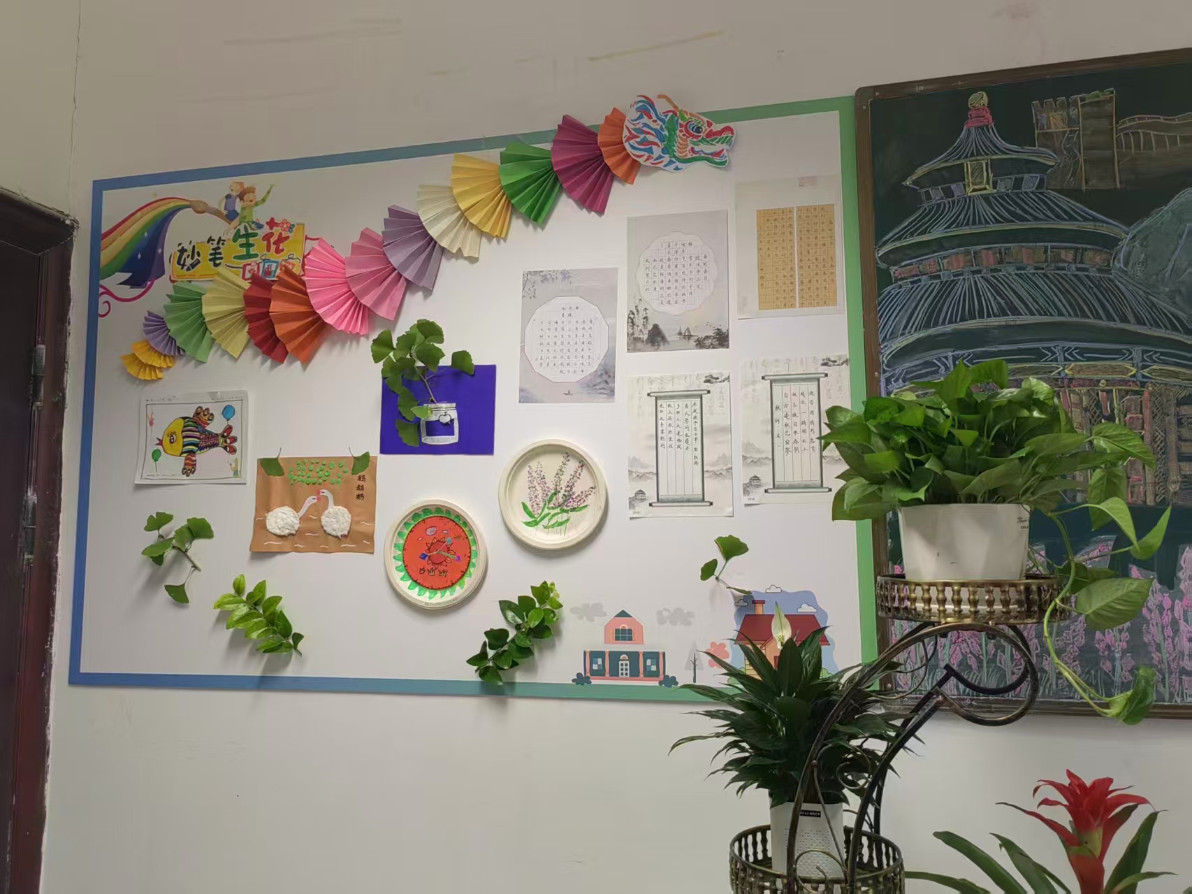 五彩纸飞机悬于教室间,暖心祝福书签缀于展板上,梅兰竹菊国画装裱挂墙面,手工折扇拼贴成一片烂漫“花海”……10月22日,美术学院“大学生你好艺术家创意美工坊”社团走进安庆四中太平寺校区710班级,以“诗画入墙,国画诗班”为主题开展活动。团队带领师生一同折纸塑形态、制签传心意,以创意为笔、巧思为墨,在动手中解锁传统文化新体验,为教室换上满溢韵味的“文化新装”。