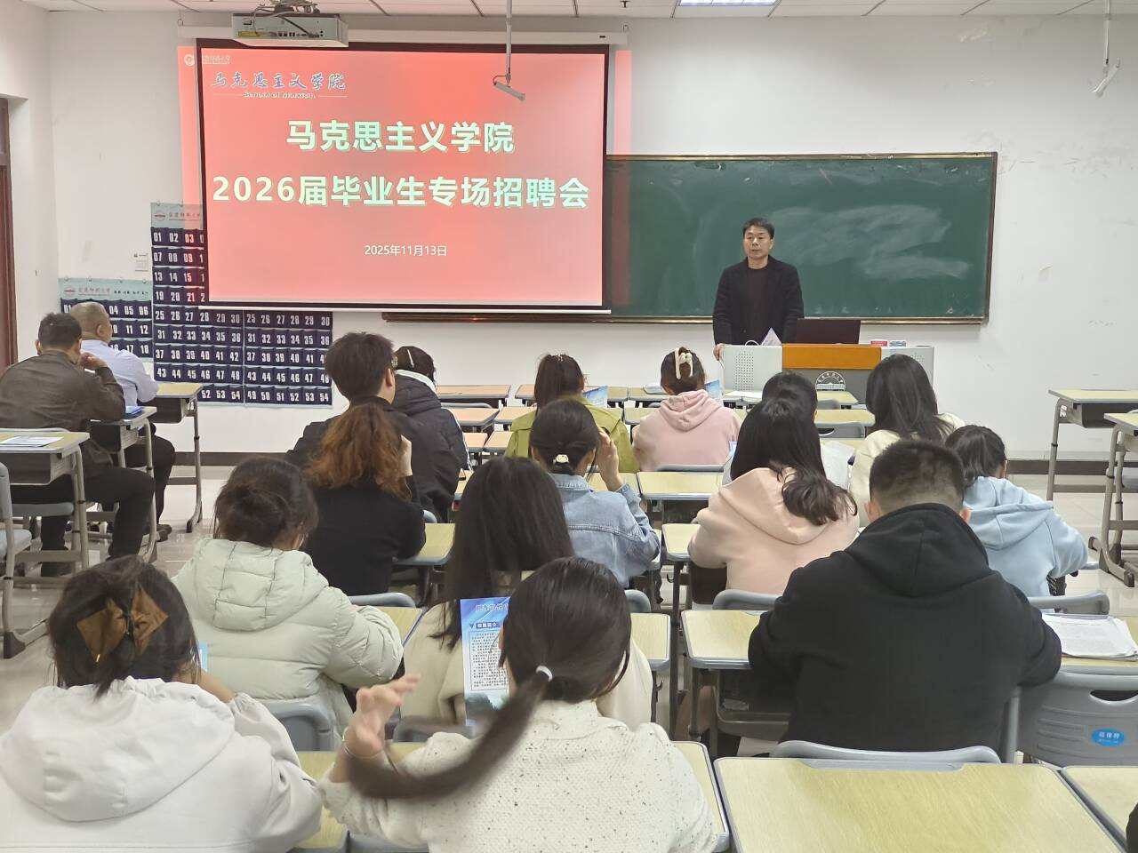 11月13日,马克思主义学院在Q308教室举办2026届毕业生专场招聘会,肥东凯悦中学、叶集皖西当代中学等数家用人单位及60余名毕业生参加。