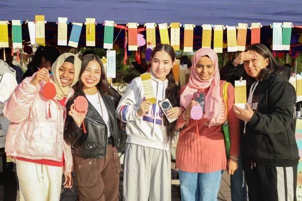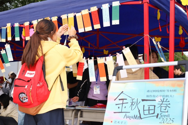 敬敷广场的“秋日丰收墙”前人头攒动,色彩鲜亮的便签纸在展板上层层叠叠,学生们手持笔杆低头写下“祝秋安,愿人安”“秋有三五七言,我有几朵浪漫”“金秋硕果、快乐满怀”等各种各样的收获与祝福。不少外国留学生也留下了祈愿卡片。