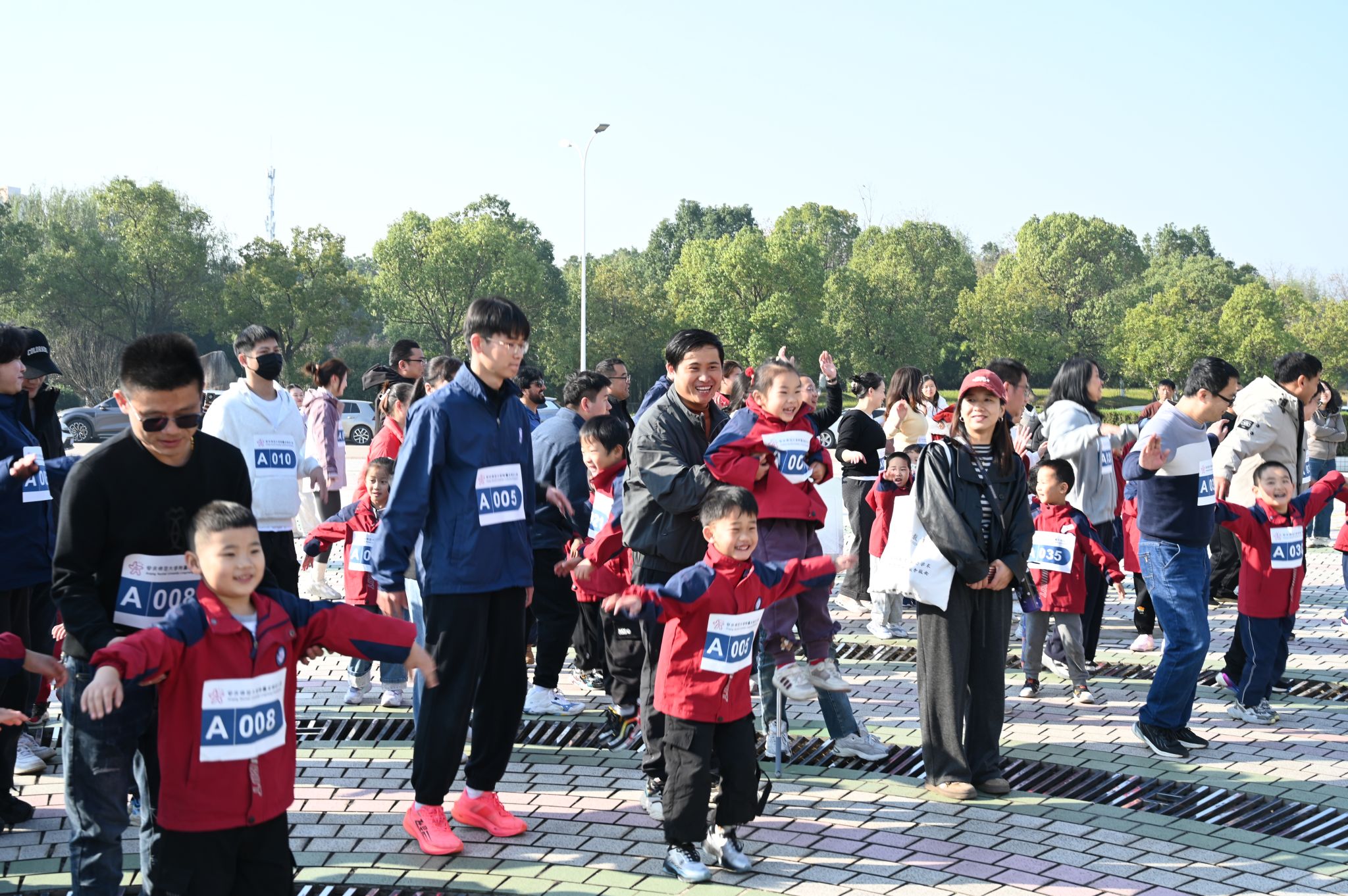 精彩的表演环节点燃了现场气氛。体育学院的学生们带来了独具特色的黄梅戏拉丁舞表演,传统戏曲与现代舞蹈巧妙融合,赢得了现场亲子家庭的阵阵掌声。热身环节中,在幼儿园老师的带领下,大小朋友们一同跳起活力满满的亲子热身操,伸臂、弯腰、蹦跳,动作整齐划一,笑声与音乐交织成欢乐的旋律,为即将开始的马拉松比赛做好了充分准备。