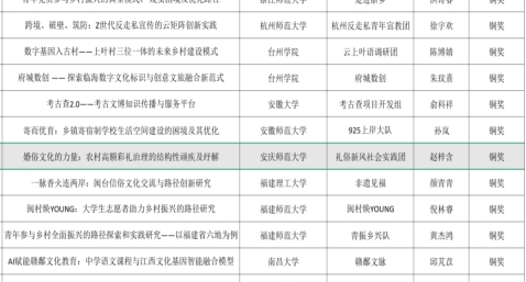 近日,全国新文科实践创新大赛决赛结果揭晓。法学院法学专业本科生赵梓含、社会工作专业研究生李晶等学生组成的礼俗新风社会实践团,凭借作品《婚俗文化的力量:农村高额彩礼治理的结构性顽疾及纾解》荣获全国铜奖,取得我校在该项赛事中的最佳成绩。