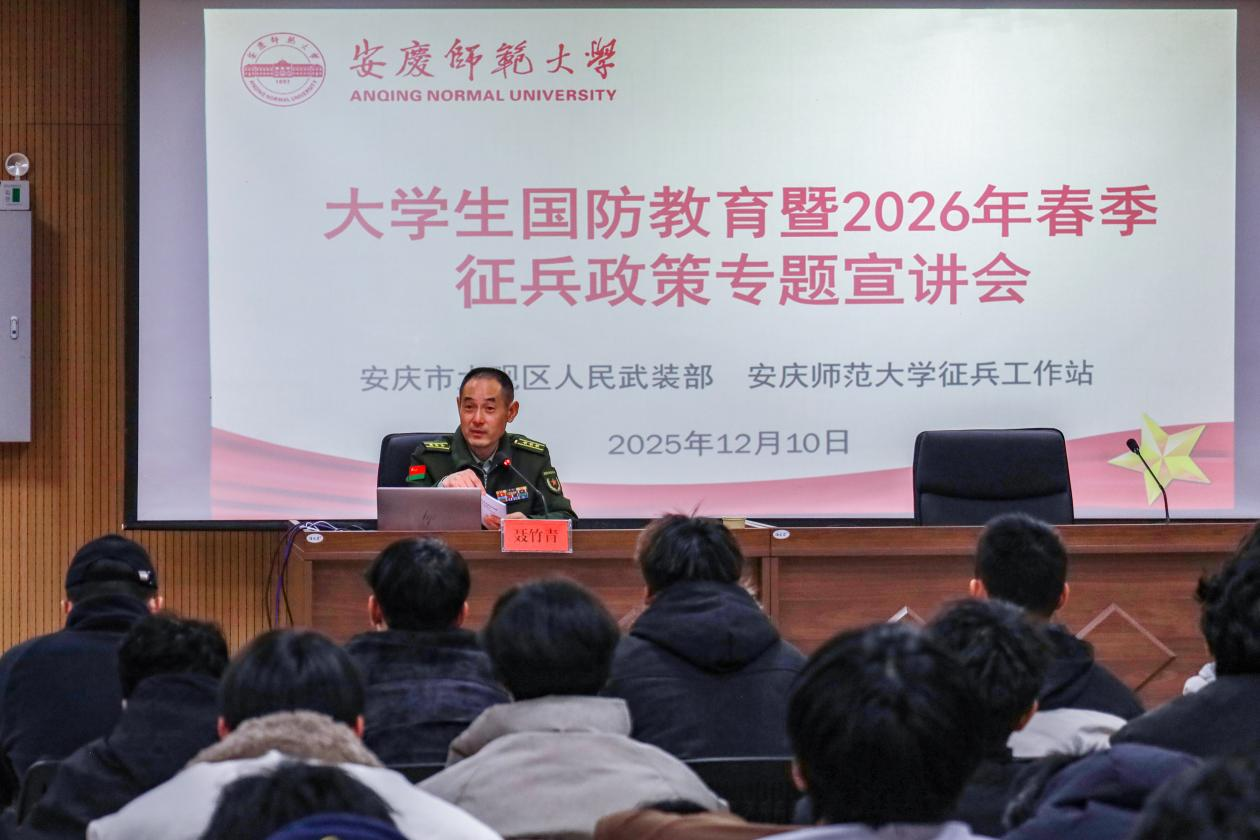12月10日,学校于龙山校区经济与管理学院112报告厅开展大学生国防教育暨2026年春季征兵政策专题宣讲会。大观区人民武装部聂竹青上校受邀出席本次宣讲会,学生处征兵工作人员,以及全校百余名学生参会。