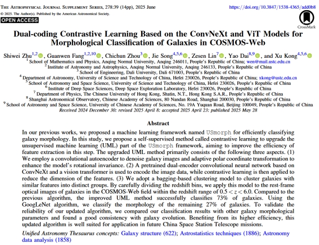 近日,数理学院统计学2023级研究生朱世伟与导师团队合作的研究成果《Dual-coding Contrastive Learning Based on the ConvNeXt and ViT Models for Morphological Classification of Galaxies in COSMOS-Web》在国际学术期刊《The Astrophysical Journal Supplement Series》(中科院二区TOP期刊,影响因子IF=8.50)发表,论文通讯作者为数理学院方官文研究员。