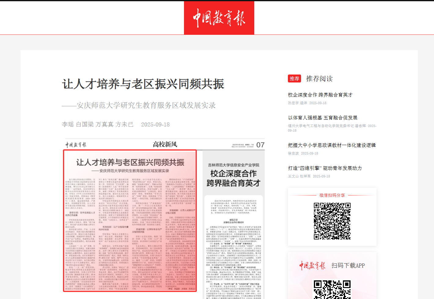 【中国教育报】让人才培养与老区振兴同频共振 ——安庆师范大学研究生教育服务区域发展实录https://share.app3.jyb.cn/paper_d/927fef9fc832f77fa7cd7858f92e37de?from=VjZDc29lWmRlREZnUWRtcXVVam1CTmltUUNUZlRyTzVyL0ZERllQcmFXT0RrT2FvVGRGTXFuNHl0ZVd2N1Axdg==