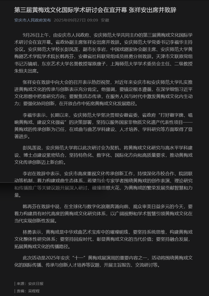 【安庆市人民政府发布】 第三届黄梅戏文化国际学术研讨会在宜开幕 张祥安出席并致辞https://mp.weixin.qq.com/s/CUGszFSmifn6mVPmT-gAPw