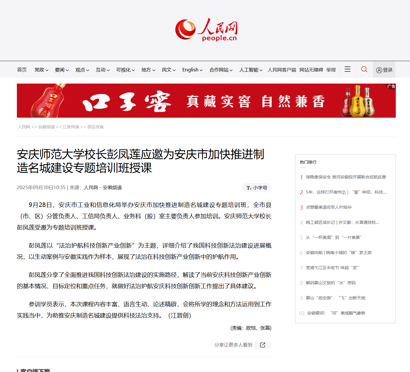 【人民网】安庆师范大学校长彭凤莲应邀为安庆市加快推进制造名城建设专题培训班授课http://ah.people.com.cn/n2/2025/0930/c374164-41369723.html
