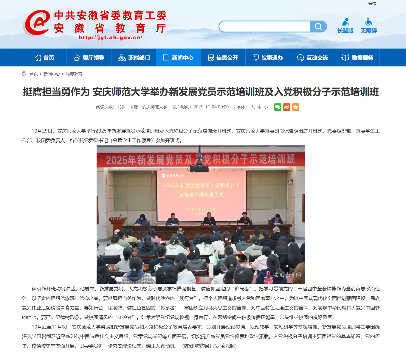 【安徽教育网】挺膺担当勇作为 安庆师范大学举办新发展党员示范培训班及入党积极分子示范培训班https://jyt.ah.gov.cn/xwzx/gdjy/40771472.html