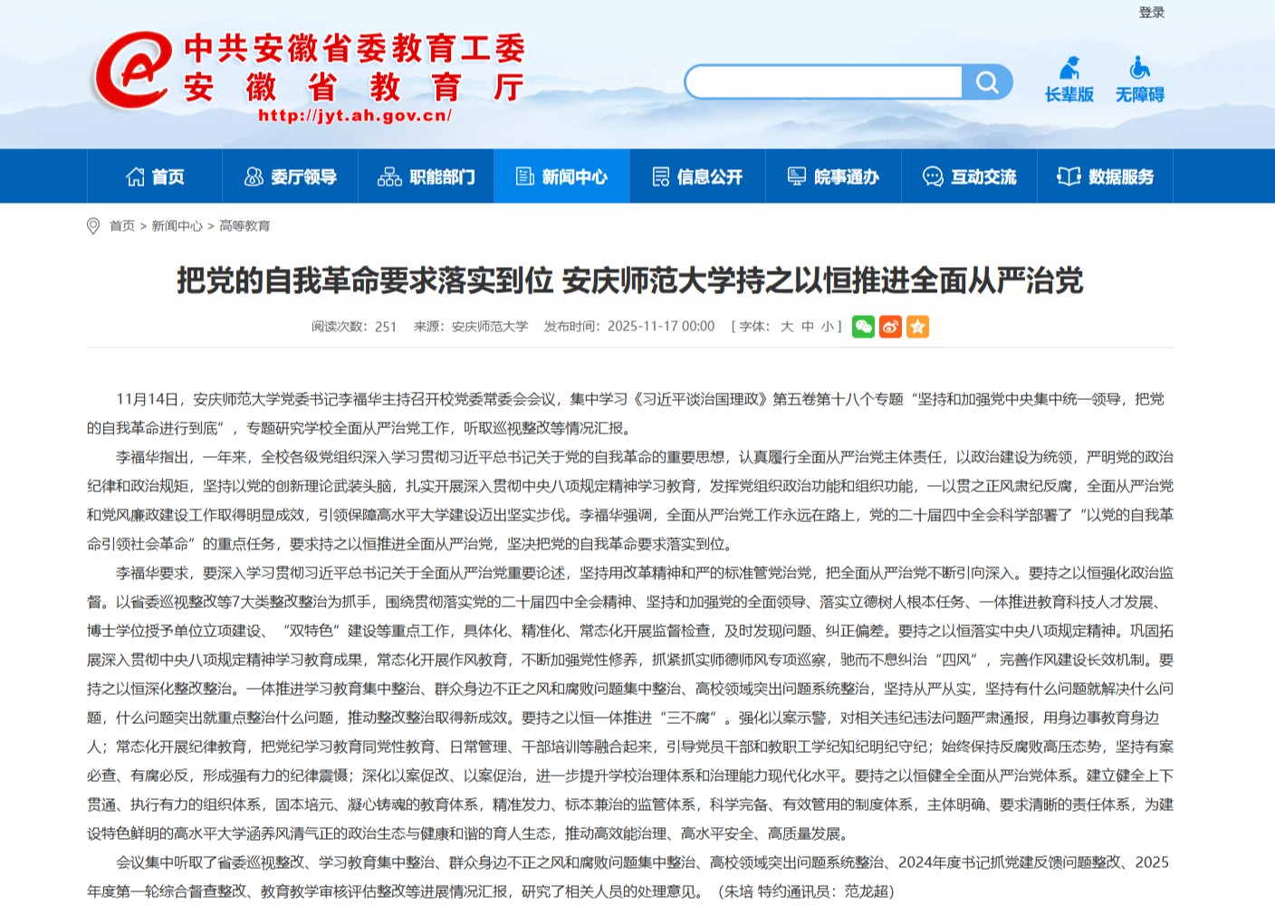 【安徽新闻网】把党的自我革命要求落实到位 安庆师范大学持之以恒推进全面从严治党https://jyt.ah.gov.cn/xwzx/gdjy/40772921.html