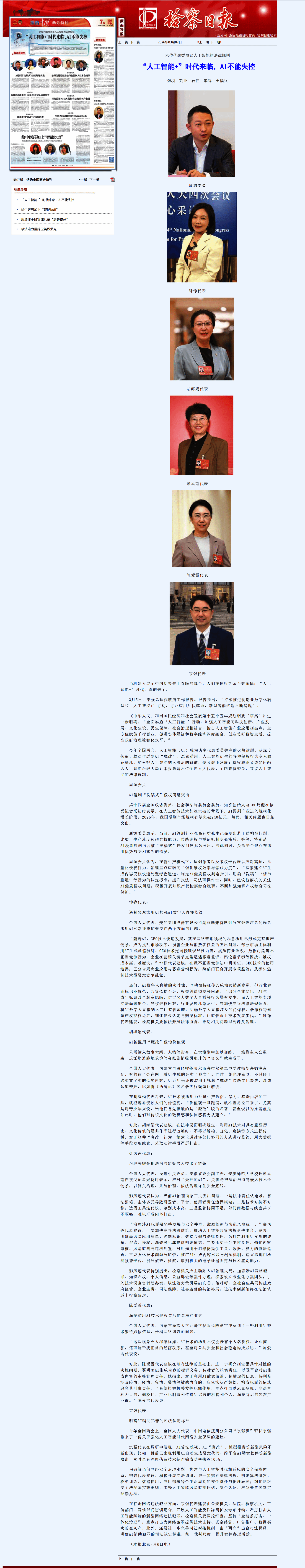 来源:【检察日报】六位代表委员谈人工智能的法律规制 “人工智能+”时代来临,AI不能失控https://newspaper.jcrb.com/2026/20260307/20260307_007/20260307_007_1.htm