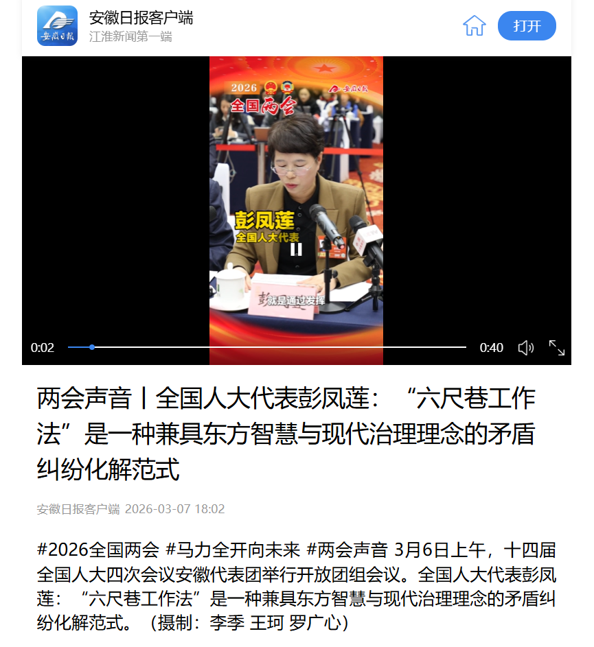 来源:【安徽日报客户端】两会声音丨全国人大代表彭凤莲:“六尺巷工作法”是一种兼具东方智慧与现代治理理念的矛盾纠纷化解范式https://app.ahnews.com.cn/displayTemplate/news/videoDetail/129/1697847.html?isShare=true