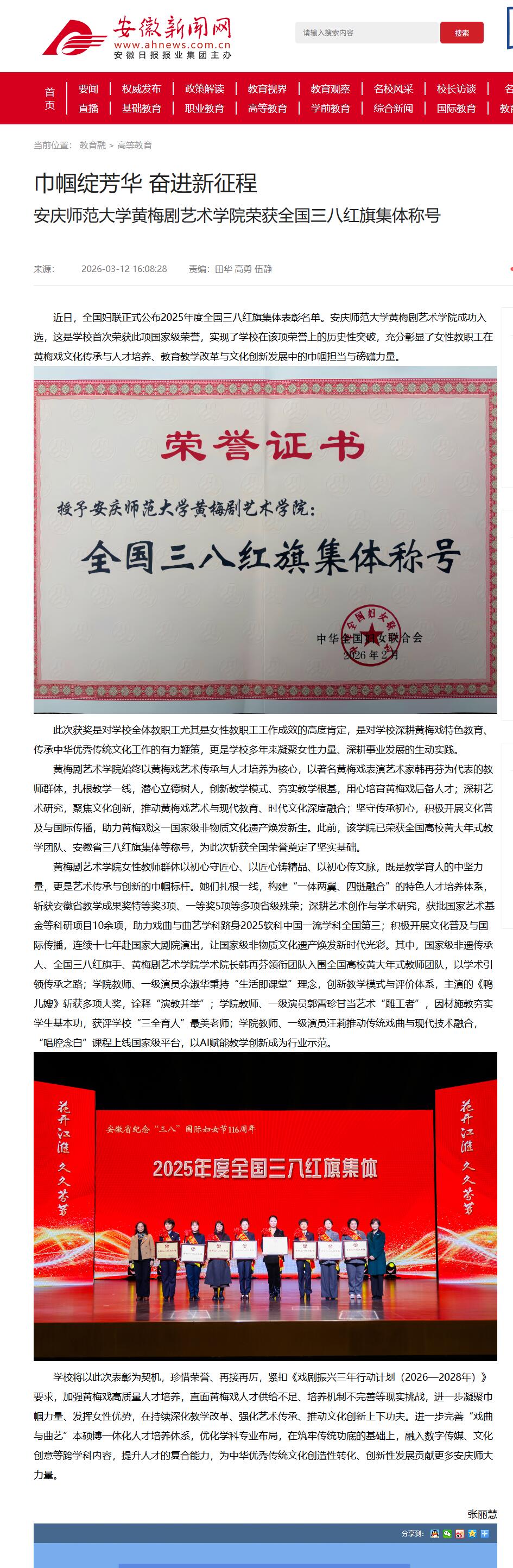 来源:【安徽新闻网】巾帼绽芳华 奋进新征程 安庆师范大学黄梅剧艺术学院荣获全国三八红旗集体称号http://xxt.ahnews.com.cn/news/2026/03/12/c_46242.htm