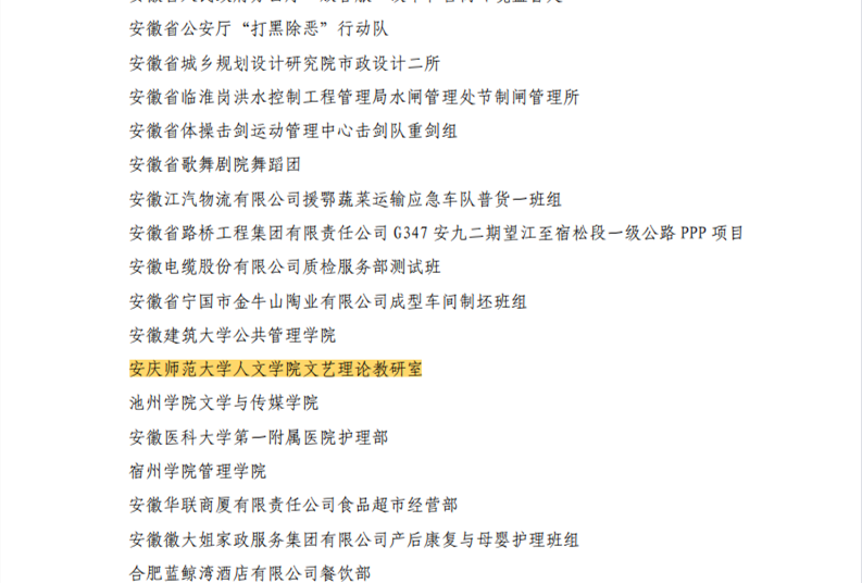 近日,安徽省总工会发文,授予我校人文学院文艺理论教研室2020年度“安徽省工人先锋号”称号。