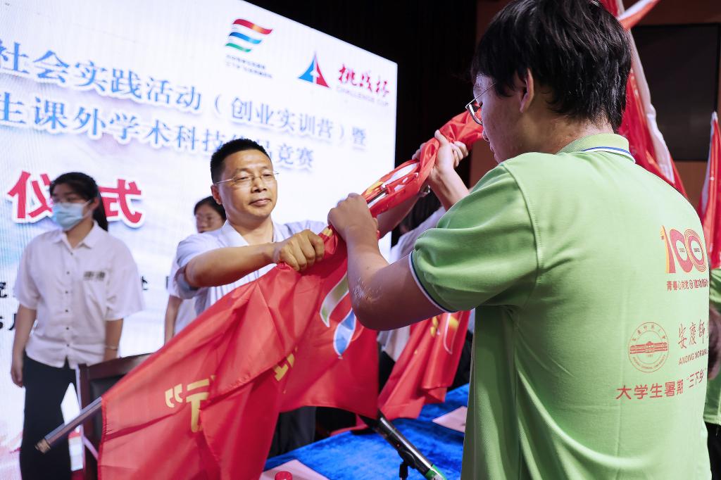 启动仪式上,汪时珍与相关部门负责人共同按启安庆师范大学2022年大学生暑期“三下乡”社会实践活动暨2023年“挑战杯”大学生课外学术科技作品竞赛启动屏幕,向27支校级重点团队和创业实训营授旗。作为举办暑期创业实训营的合作单位、安庆市人力资源和社会保障局副局长方敏做指导讲话,指导教师代表汪翘楚、学生代表黄怡然分别做表态发言,志愿者进行了集体宣誓。