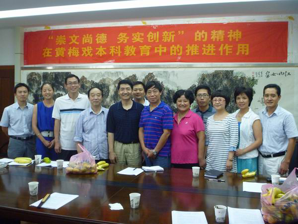 9月12日下午,我校召开了以“‘崇文尚德、务实创新’的精神在黄梅戏本科教育中的推进作用”为主题的研讨会。副院长张群出席了会议,国家一级作曲家陈儒天,国家一级演员郭霄珍、潘启才、江丽娜等著名黄梅戏艺术家和教务处相关领导、音乐(黄梅剧艺术)学院专业老师一同参加了研讨。会议由音乐(黄梅剧艺术)学院副院长杨瑾主持。