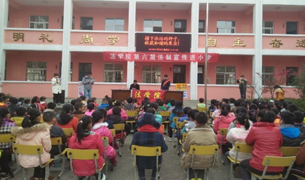 当天上午,由近百名法学院学生组成的10支小分队,从学校出发走进农村、社区、学校和车站宣传宪法知识。