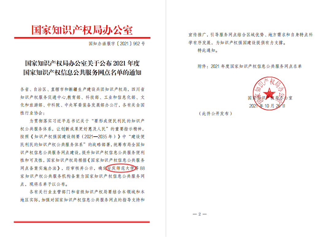 10月26日,国家知识产权局公布了2021年度国家知识产权信息公共服务网点名单,安庆师范大学名列其中。