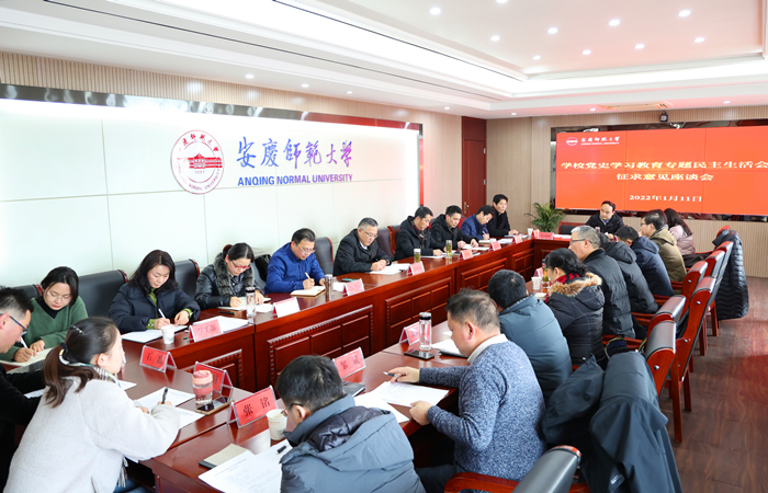 为高质量开好学校领导班子党史学习教育专题民主生活会,坚持发扬民主、开门纳谏,根据上级有关文件精神和《安庆师范大学校级领导班子党史学习教育专题民主生活会实施方案》要求,学校领导班子在前期发放征求意见函基础上,近日,学校组织召开党史学习教育专题民主生活会会前前征求意见座谈会,继续广泛听取党员、干部和群众的意见建议,党委书记许继荣,党委副书记、校长闵永新,党委副书记吴照明分别召集组织征求意见座谈会,部分二级学院党政负责人、高层次人才代表、党外人士代表、新进教师代表、青年教师代表、全国全省样板党支部书记代表等参加座谈会。
