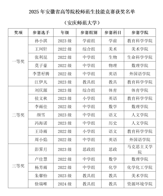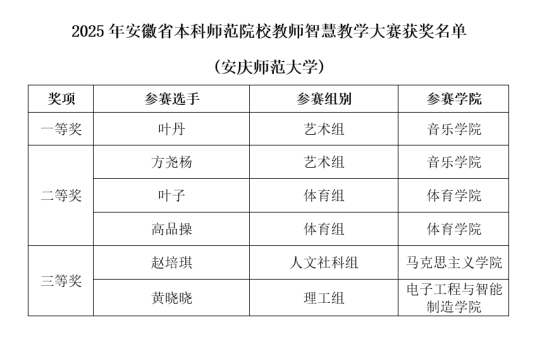 10月31日至11月2日,2025年安徽省高等院校师范生教学技能竞赛暨安徽省本科师范院校教师智慧教学大赛在合肥师范学院举办。我校师生在此次大赛中再创佳绩,共斩获一等奖7项、二等奖10项、三等奖7项的优异成绩,其中教师组获一等奖1项、二等奖3项、三等奖2项,学生组获一等奖6项、二等奖7项、三等奖5项。