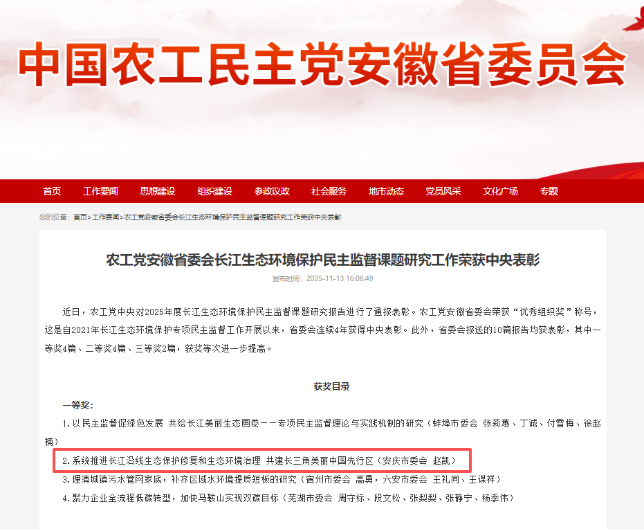 近日,农工党中央对2025年度长江生态环境保护民主监督课题研究报告进行了通报表彰。由我校生命科学学院赵凯教授领衔的民主监督课题“系统推进长江沿线生态保护修复和生态环境治理 共建长三角美丽中国先行区”荣获一等奖。
