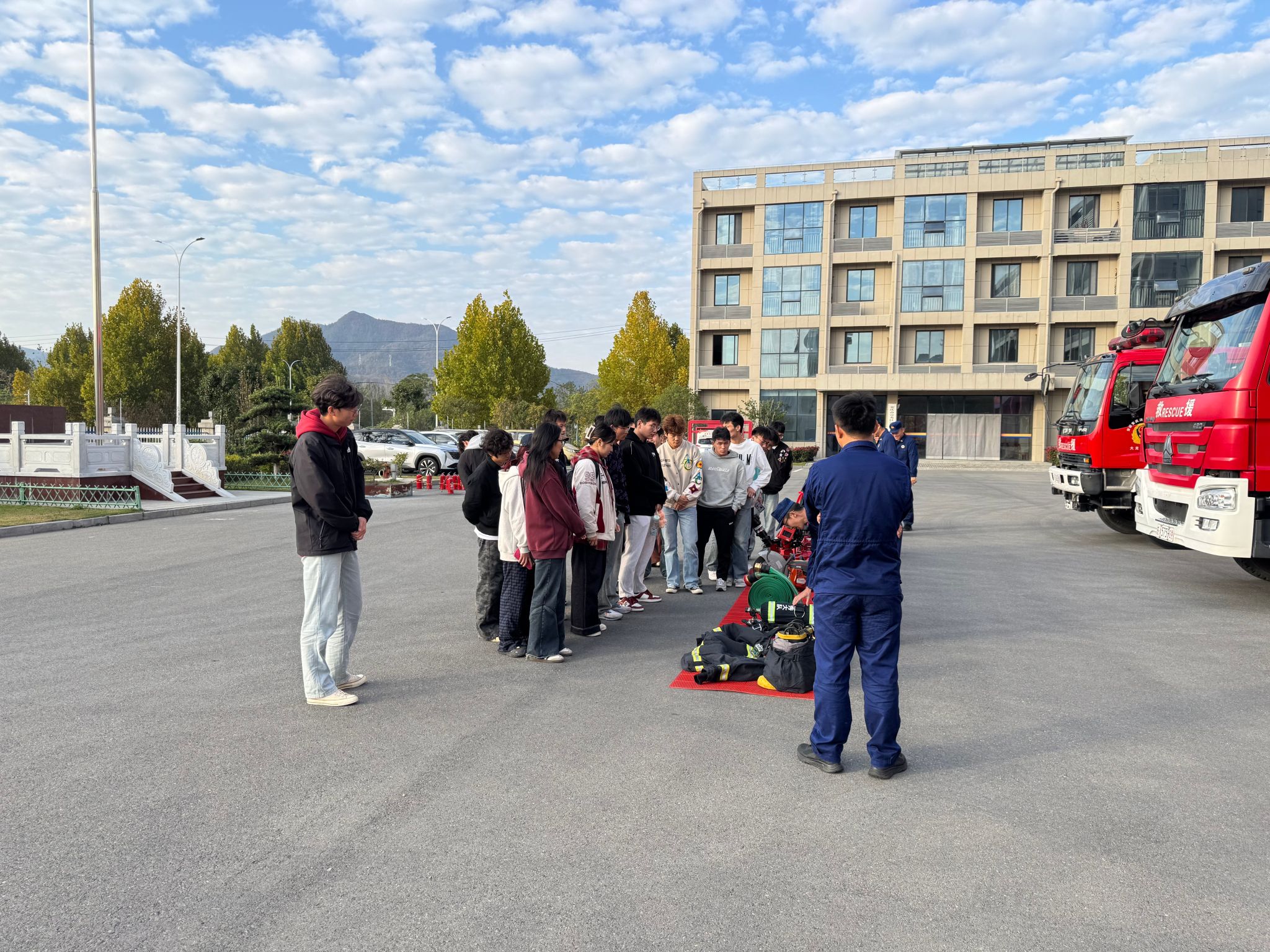 组织消防体验。师生代表走进消防救援站,学习家庭用火用电用气安全知识、参观消防救援装备器材。学生们戴上消防救援空气呼吸器,身穿消防救援服,熟练使用灭火器,参与灭火演练。通过理论讲解与现场演示相结合的方式,提升了应对突发火灾事故的实战能力。