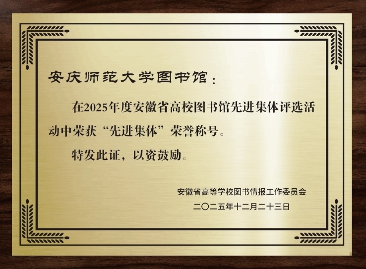 日前,安徽省高等学校图书情报工作委员会公布了“安徽省高校图书馆2025年度先进集体和先进个人名单”,我校图书馆连续第三年获评“先进集体”,三名职工获评“优秀馆长”“先进工作者”。