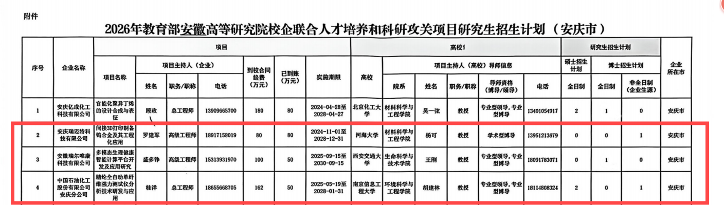 近日,我校3个科研团队成功获批“2026年教育部安徽高等研究院校企联合科研与人才培养项目”招生计划,其中博士研究生招生计划3项,与西安交通大学、河海大学、南京信息工程大学三所省外“双一流”高校首次建立博士联合培养合作关系,构建起跨区域、高水平的协同育人新机制,为学校更好服务国家战略需求和区域产业升级注入了新的动能。