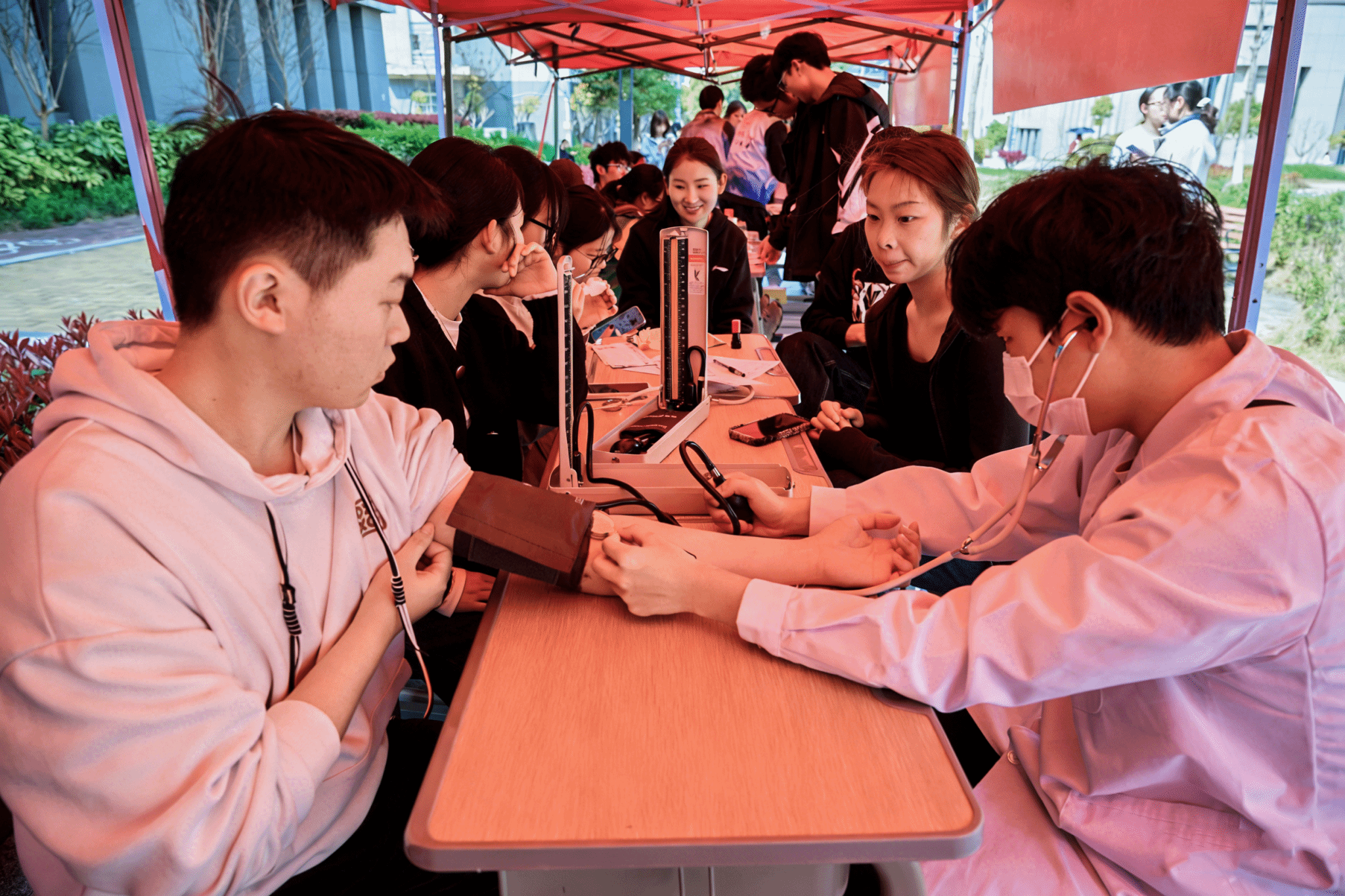 体育与健康学院“科学康复,乐享运动”展台前同样人气爆棚,测量血压、咨询健康的学生络绎不绝。“同学,你的血压状况良好,平时要坚持规律运动、合理作息哦。”运动康复专业2024级的刘志宇化身“健康顾问”,熟练地为前来“问诊”的同学绑好血压袖带、规范操作测量仪器,细致解读血压数据,耐心普及科学运动、日常养护等相关知识。“能结合专业所学为身边同学办实事,帮助他们了解自身健康状况,我感到特别充实。”刘志宇笑着说道。