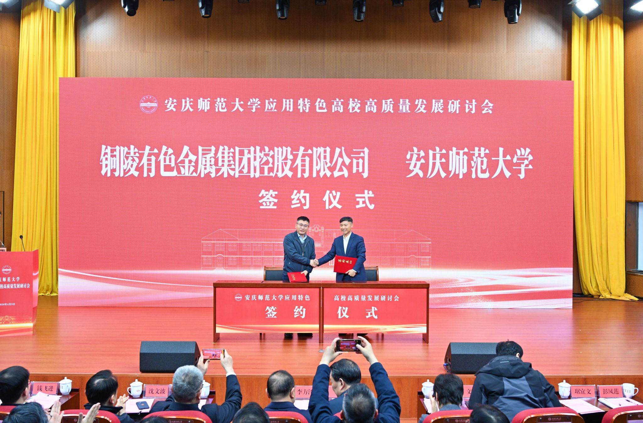 4月3日,学校举行应用特色高校高质量发展研讨会。中国工程院院士彭寿,中国科学院大学长聘教授琚宜文,安徽省教育厅二级巡视员李方泽,安庆市人民政府副市长李岩,安徽省教育厅高教处处长蒋正飞,安徽省院士专家联合会党委书记戴建华,铜陵有色金属集团股份有限公司党委书记、总经理文燕,中国石化安庆石化公司副总工程师沈文波,力合科技股份有限公司总经理钱飞进受邀出席研讨会。
