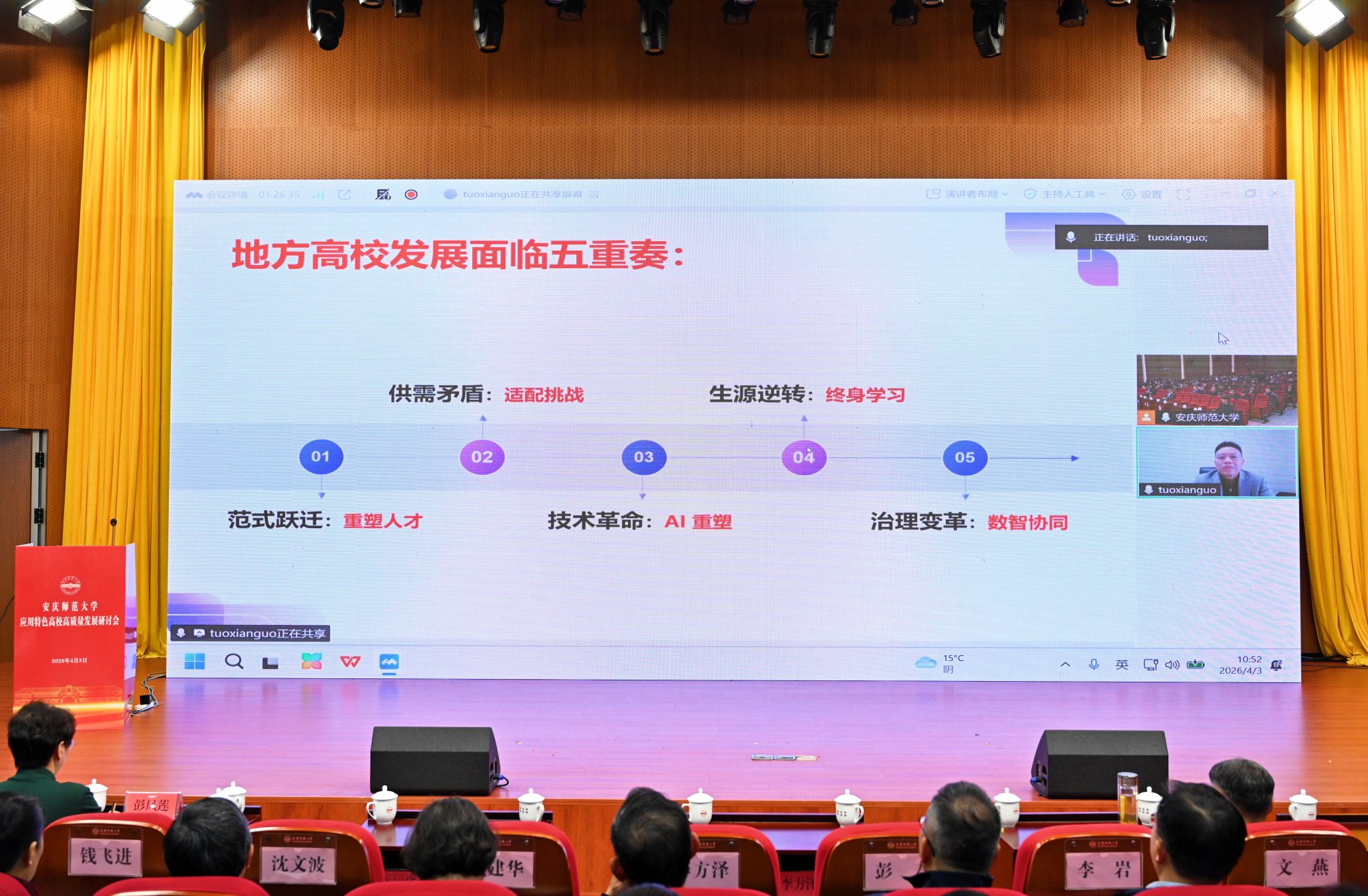 彭凤莲表示,报告言辞恳切、精彩纷呈、指导性强,为安庆师范大学破解发展瓶颈、深耕特色内涵、推动应用型深度转型提供了宝贵经验。她要求全体参会人员认真学习领会报告精神,提高政治站位,深刻领会应用特色高校高质量发展的根本要求;聚焦内涵建设,精准锚定应用特色高校高质量发展的核心路径;强化使命担当,主动扛起应用特色高校服务地方发展的时代责任,为加快建设教育强国和服务现代化美好安徽建设作出新的更大贡献。