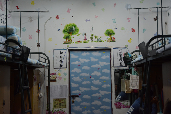 有了DIY的想法之后,孙秋阳和睡在她对面床铺的韩倩倩立刻行动起来,很快地就带动寝室其余四人加入进来。“因为大家都没有学过美术,生怕搞砸,所以开始时我们四个就保留自己的意见。后来,看到她俩沉浸在画壁画中,十分开心,我们慢慢地也加入了进来。”高丝蕾说。
