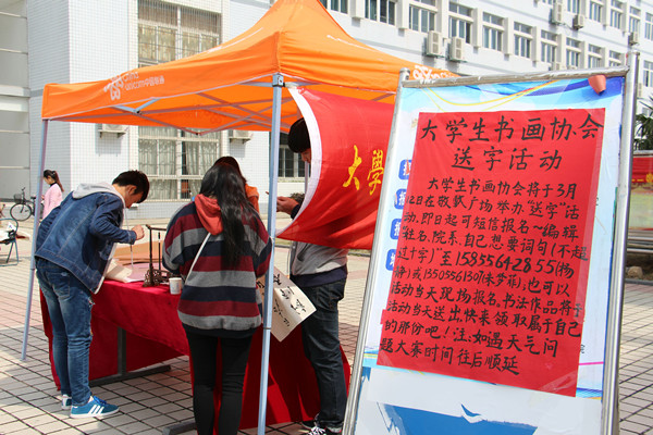 初春微润,十里墨香。3月12日,大学生书画协会第一届书法送字活动在敬敷广场顺利举行。书画协会的“小书法家”们在宣纸上泼墨挥毫,一道道“墨香大餐”也吸引了众多同学们前来参与。