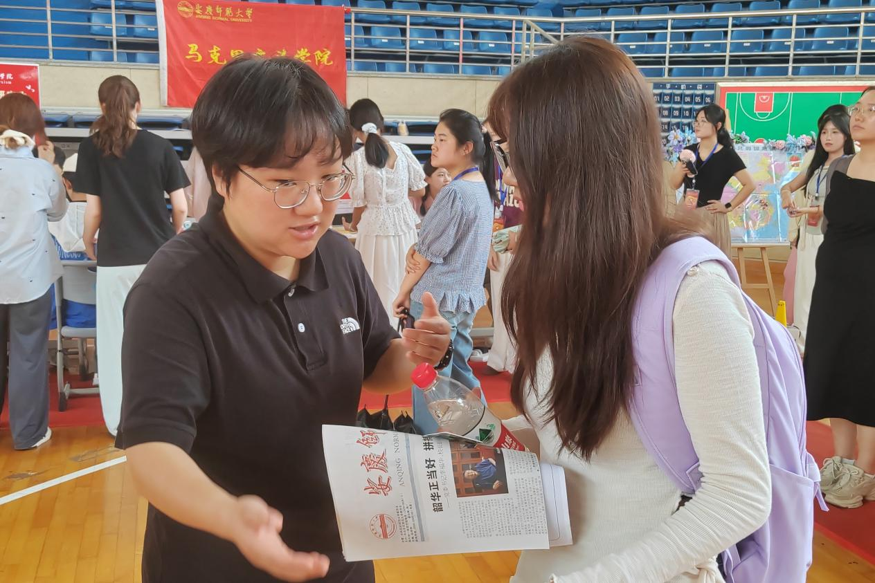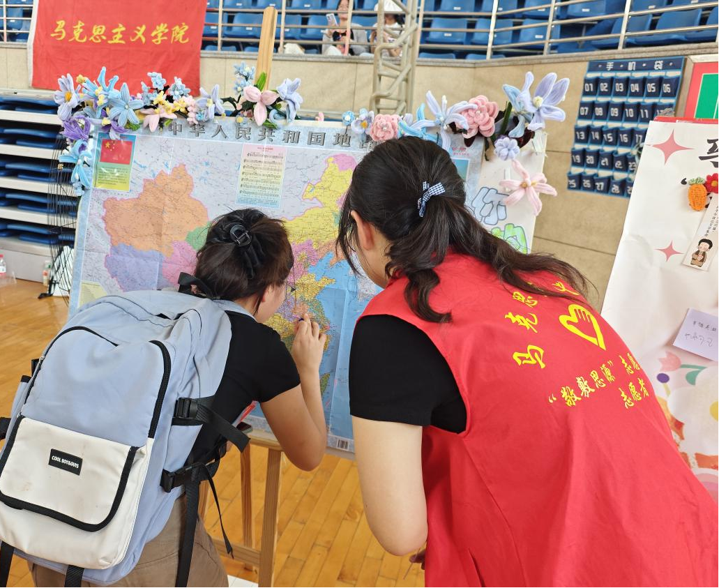 在报到点,学院也设置了一系列互动游戏,这些活动不仅拉近了新生与陌生环境的距离也记录下新生们对未来的美好憧憬。“很多新生是第一次离开家乡,所以我们做了这个地图,让大家在地图上找出自己的家乡,共同完成这个小小的成长教育活动。”思想政治教育专业2023延乔班李玉婷介绍到:“好多同学来自一个地方,地图扎不上,我们就邀请大家找出自己想要去的地方,大家都很喜欢这个互动。”“你的幸运数字是15号对吧,那么请问邓小平理论的精髓是什么?”研究生党支部根据学科特色为研究生新生们准备了“紧张刺激”的“入学考试”。“我们准备了30道基础的理论题目,让大家小小地紧张一下,答出来以后就可以抽奖获得一个小礼品。”2024级马克思主义理论研究生潘玉龙介绍到。报到当天,2025级学科思政的新生包凯玲一直在报到点帮忙。“学长学姐们都很亲切,让我很想早点参与到集体的工作当中,也希望能早点认识新同学们。