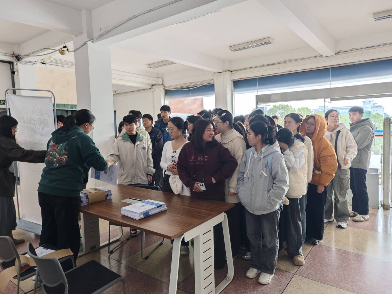 10月29日,图书馆在二楼门口举办“研途送暖”考研模拟卷免费赠送活动。活动现场,两张长桌整齐排列,各类考研模拟试卷按科目与专业分类摆放,学生们有序排成两列,依次领取这份精心准备的“冲刺助力包”。