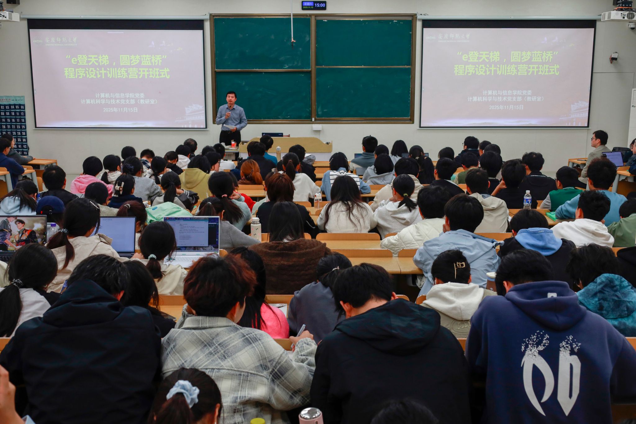 11月15日,计算机与信息学院在C108教室举行“e登天梯,圆梦蓝桥”程序设计训练营开班仪式。学院党委副书记肖之进,党委委员、计算机科学与技术党支部书记、教研室主任江克勤,教师代表及参训学员等150余人参加活动。