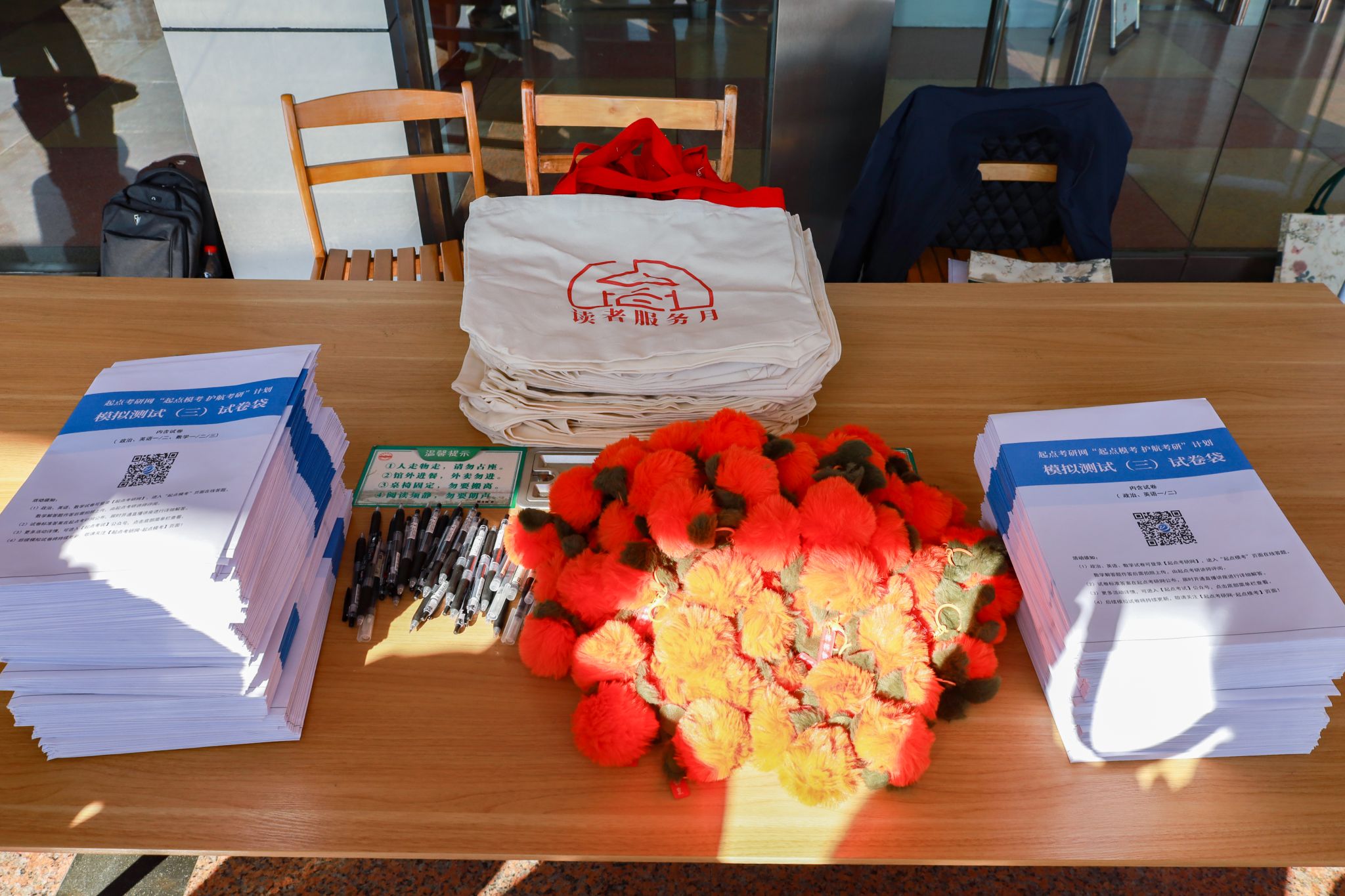 工作人员与志愿者提前布置好发放区域,将模拟试卷、文具及寓意美好的纪念品整齐陈列。涵盖多学科专业的模拟试卷根据考研专业分布精心准备,共197套,方便同学们按需领取;印有校园元素的帆布包、书写流畅的签字笔以及象征“事事如意”的精致挂件,兼具实用性与纪念意义,深受学子欢迎。