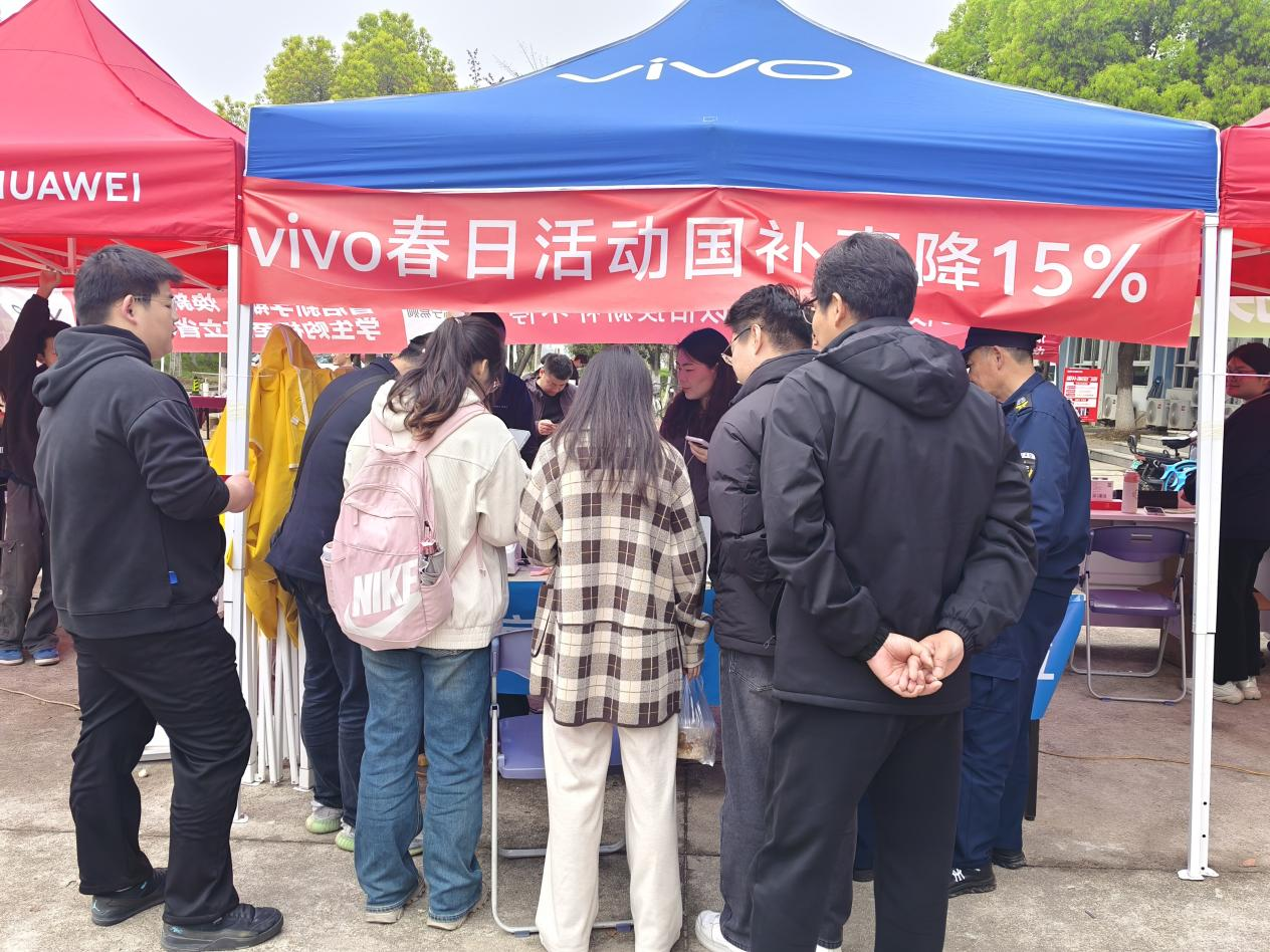 本次活动由安庆市商务局、市教育体育局、共青团安庆市委共同主办。活动汇聚华为、vivo等14家知名企业参展,涵盖手机、平板电脑、蓝牙耳机、智能穿戴等多款数码智能产品,集政策宣传、产品展示、真机体验、现场选购、旧机回收等功能于一体,为师生搭建起便捷高效的“一站式”校内服务平台。