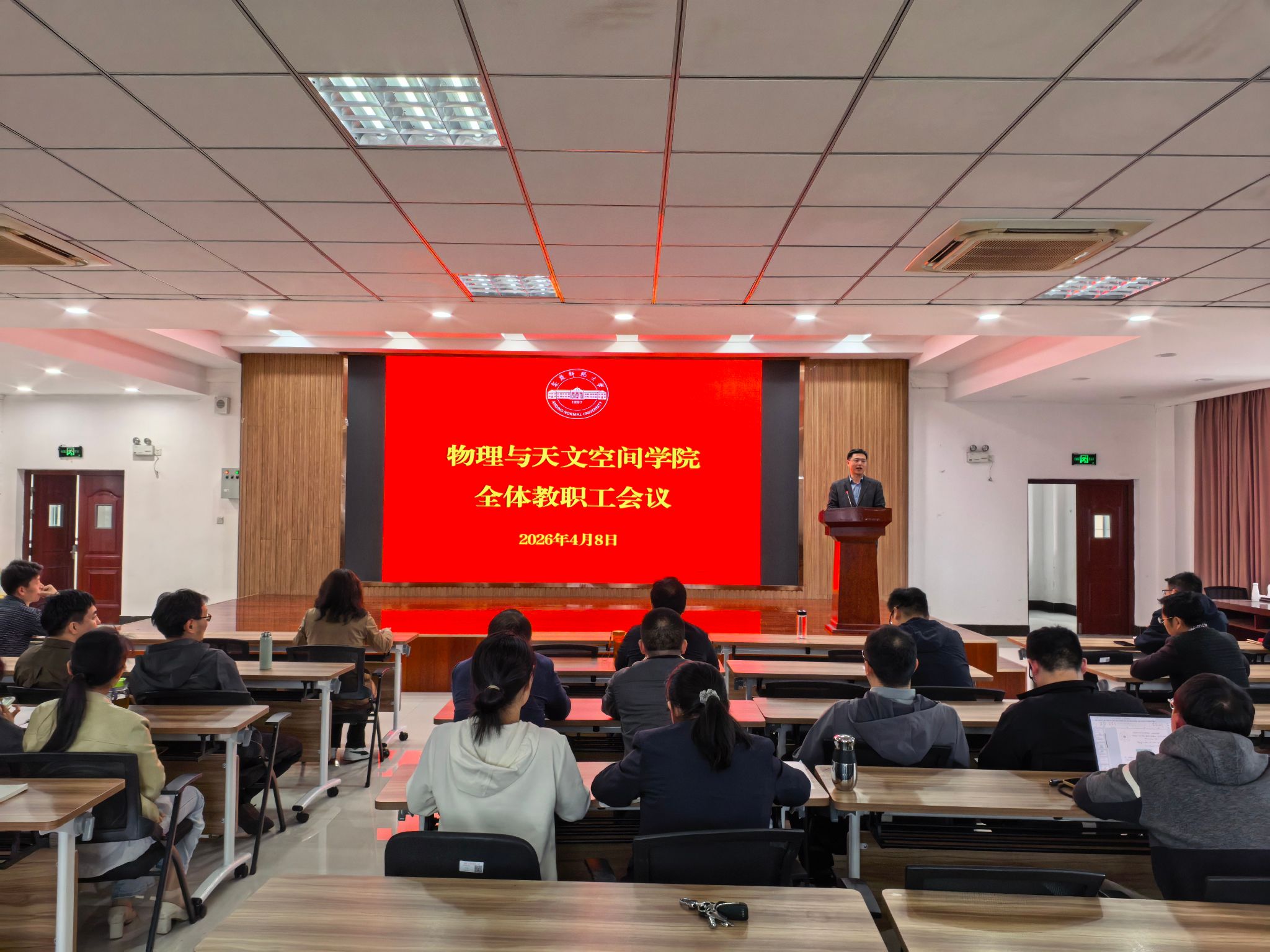 4月8日,物理与天文空间学院在I楼401报告厅召开全体教职工会议。学院党委书记陆健,副院长易明芳,党委副书记、纪委书记周刚和全体教职工参加会议。会议由陆健主持。