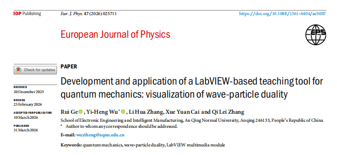 3月31日,电子信息与集成电路学院吴义恒教师团队的教学研究论文《Development and Application of a LabVIEW-Based Teaching Tool for Quantum Mechanics: Visualization of Wave-Particle Duality》正式发表于欧洲物理学会旗下专注高等物理教育研究的国际期刊《European Journal of Physics》。