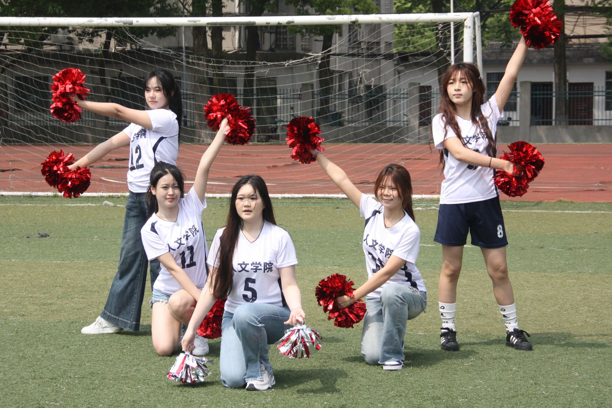 另一侧,活力四射的啦啦操队伍踏着明快节拍尽情舞动。队员们身着清爽亮眼的蓝白色上衣,高束马尾随舞步跃动飞扬,舒展有力的动作与动感十足的节奏,瞬间吸引了全场师生的目光。