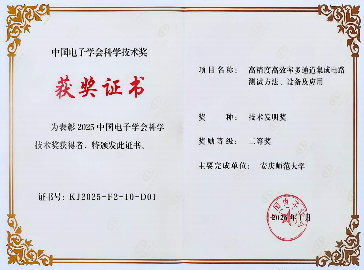 4月19日,中国电子学会正式公布了2025年度中国电子学会科学技术奖评审结果。我院詹文法教授牵头,联合悦芯科技股份有限公司、复旦大学、中国电子科技集团公司第五十八研究所共同完成的“高精度高效率多通道集成电路测试方法、设备及应用”项目,荣获技术发明二等奖。这是我校在集成电路测试技术领域取得的又一标志性成果。