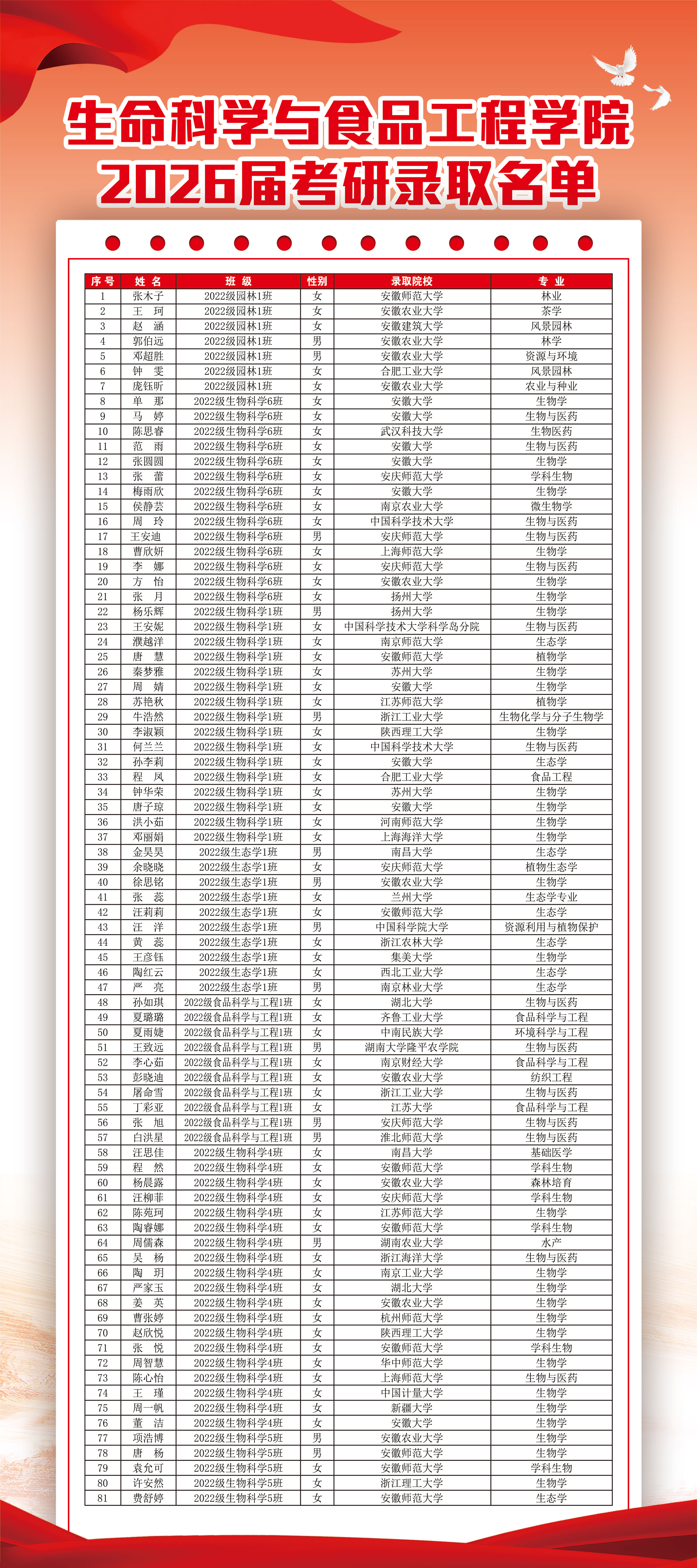 近日,2026年全国硕士研究生招生录取工作顺利落幕,生命科学与食品工程学院再传捷报。2026届本科毕业生392人,升学163人,在报考率比去年降低20%的情况下,达线率43.9%,考研录取率达41.6%,再创历史新高,用亮眼成绩彰显了学院人才培养的扎实成效。