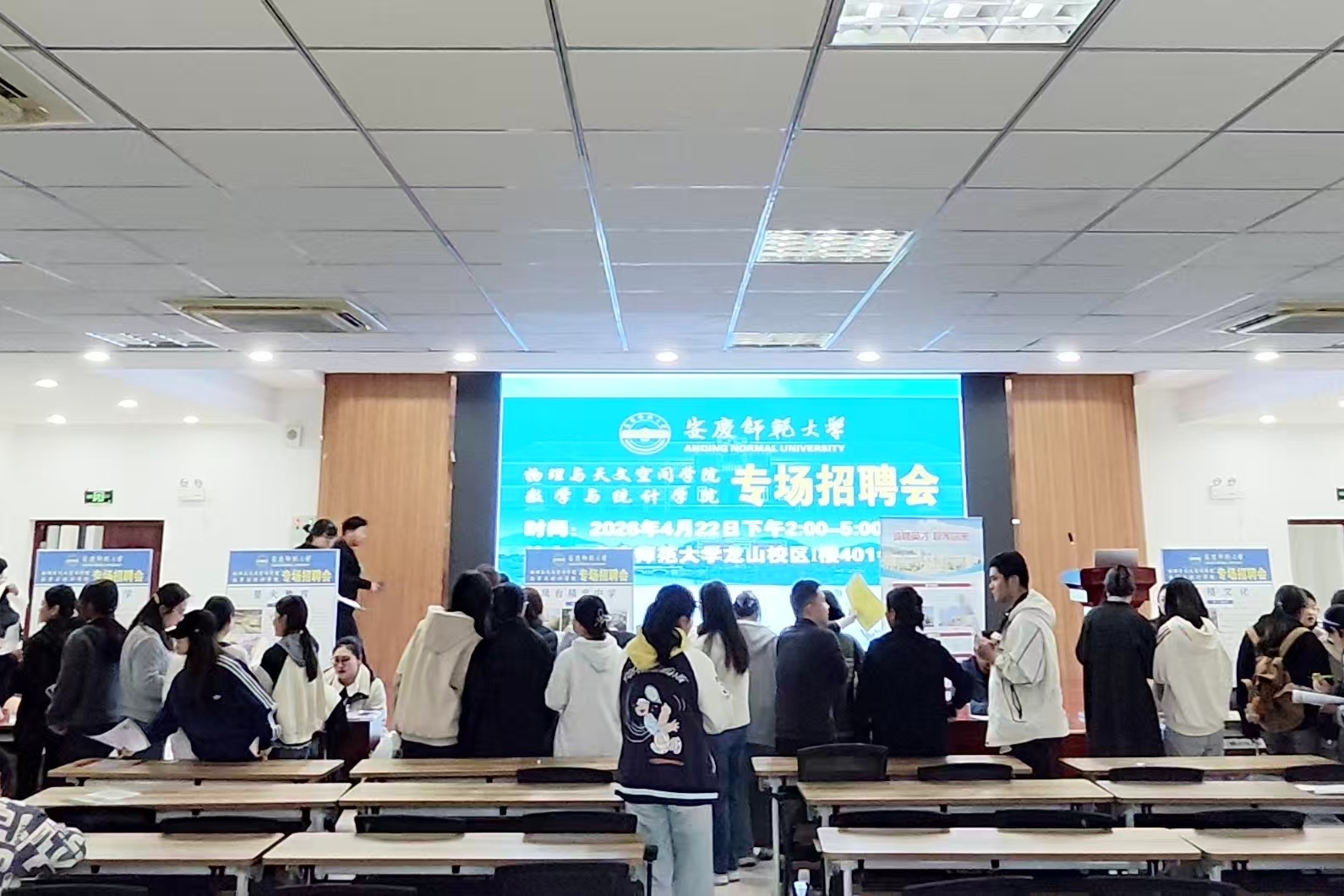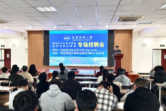 4月22日,物理与天文空间学院、数学与统计学院在I楼401报告厅联合举办了2026年春季4月专场推介招聘会。安庆市外国语学校、安庆九一六学校、安庆宜辰培训学校、安庆北辰教育、凤台精忠中学、无锡星火教育、苏州东昆睿学、苏州熠格文化、嘉兴源动力教育集团、东莞市新世纪英才学校、北京万校互联等11家用人单位,有关学院2026届毕业生和辅导员近200人参加招聘活动。