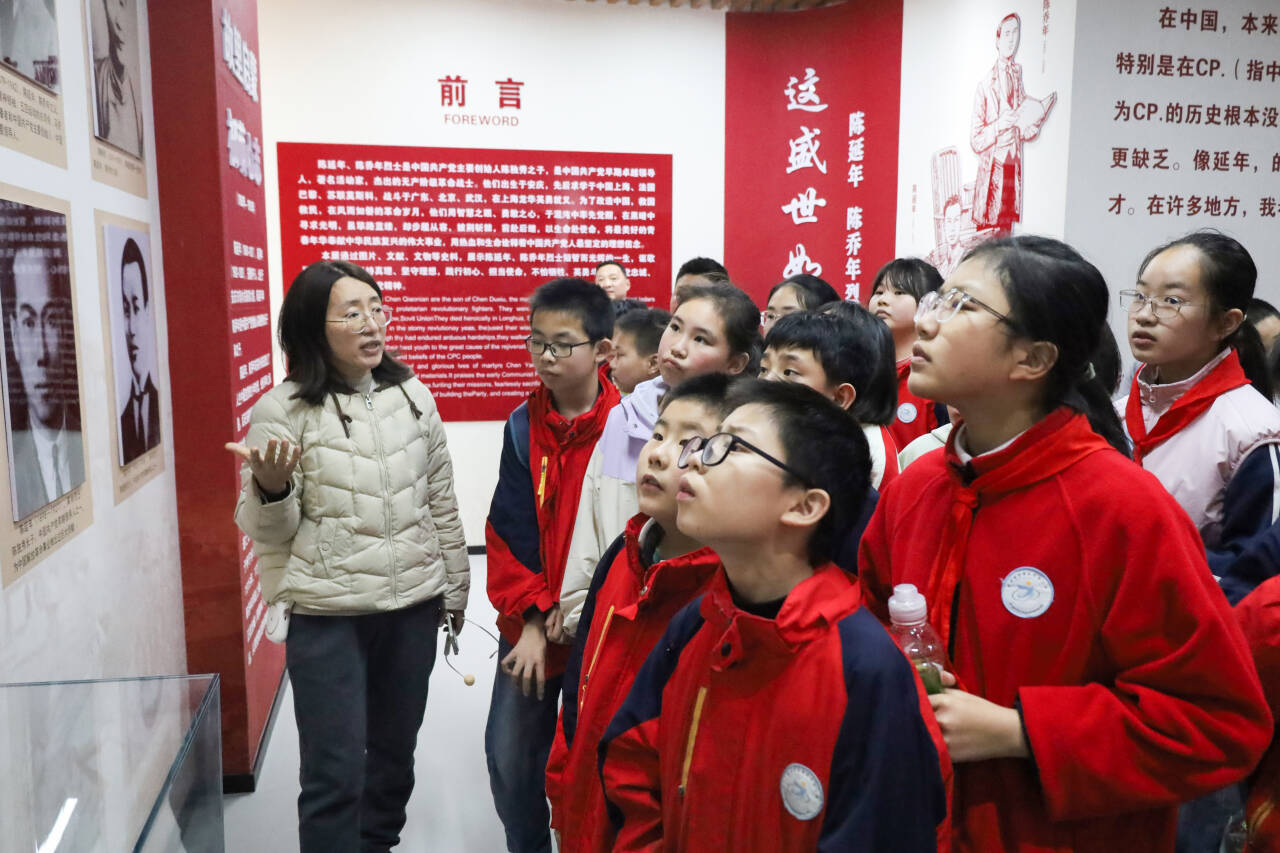 在延乔生平事迹展区,墙上悬挂着陈延年、陈乔年各时期的珍贵历史照片,玻璃展柜里陈列着相关文献资料和书籍。学生们围聚在展柜前,驻足细读图文资料。六年级4班学生赵勖一不时轻声与同伴交流感悟。“展览区那些泛黄的照片里,两兄弟年轻而坚毅的面容让我深受触动。”她表示,照片与书籍中记载着革命先辈为理想奋勇献身的故事,让她深切感受到先烈的崇高与伟大,体会到当下幸福生活的来之不易。