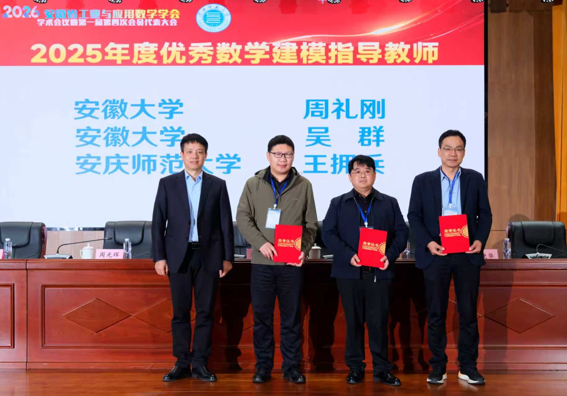 4月24日至26日,安徽省工业与应用数学学会2026年度学术会议暨第一届第四次会员代表大会在安徽省淮北市召开。数学与统计学院院长张海、副院长陈文兵与学院骨干教师王拥兵教授、张红梅教授、戴林送副教授、刘晨博士参会。会上,王拥兵荣获2025年度“安徽省数学建模优秀指导教师”荣誉称号,全省仅三人获此殊荣。
