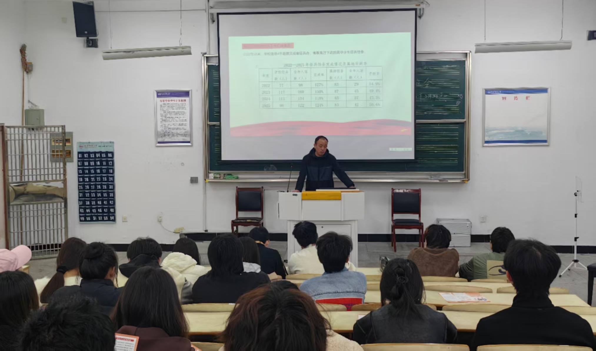 4月22日,音乐学院在艺术楼B107举行2026年征兵动员宣讲会。校人民武装部王友兵作宣讲。