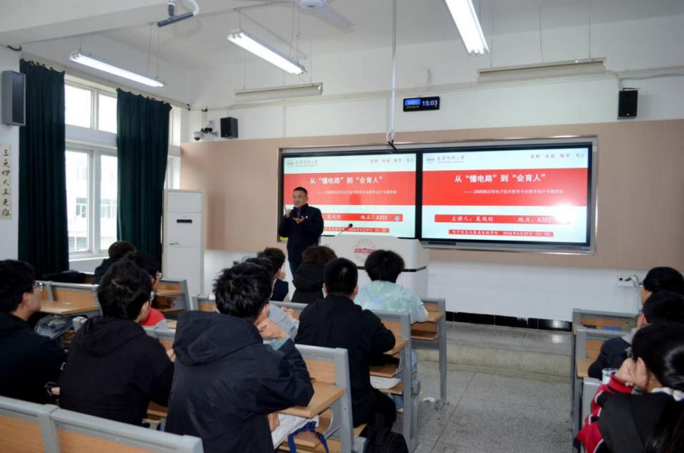 4月29日下午,电子信息与集成电路学院在教学楼A202教室成功举办《从“懂电路”到“会育人”——应用电子技术教育专业师范生教学设计与实施》专题备赛讲座。学院副院长詹文法出席并主持活动,吴兆旺老师担任主讲,2025级应用电子技术教育专业全体学生参加培训。