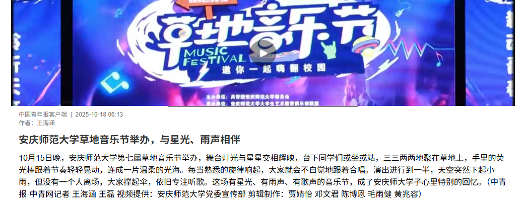 【中国青年报客户端】安庆师范大学草地音乐节举办,与星光、雨声相伴https://s.cyol.com/articles/2025-10/18/content_MbnO9YIn.html?gid=Zr5xz31e