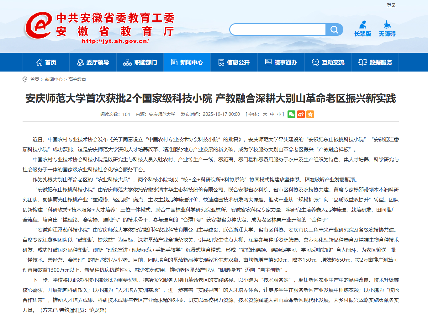 【安徽教育网】安庆师范大学首次获批2个国家级科技小院 产教融合深耕大别山革命老区振兴新实践https://jyt.ah.gov.cn/xwzx/gdjy/40769206.html