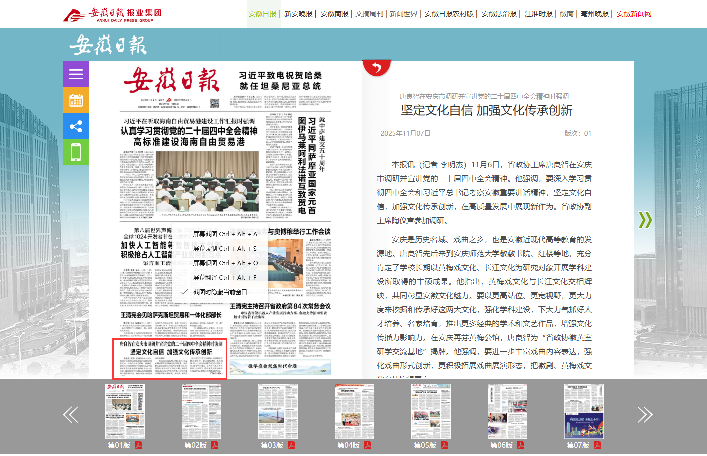 【安徽日报】唐良智在安庆市调研并宣讲党的二十届四中全会精神时强调 坚定文化自信 加强文化传承创新https://szb.ahnews.com.cn/ahrb/layout/202511/07/node_01.html#c1111877